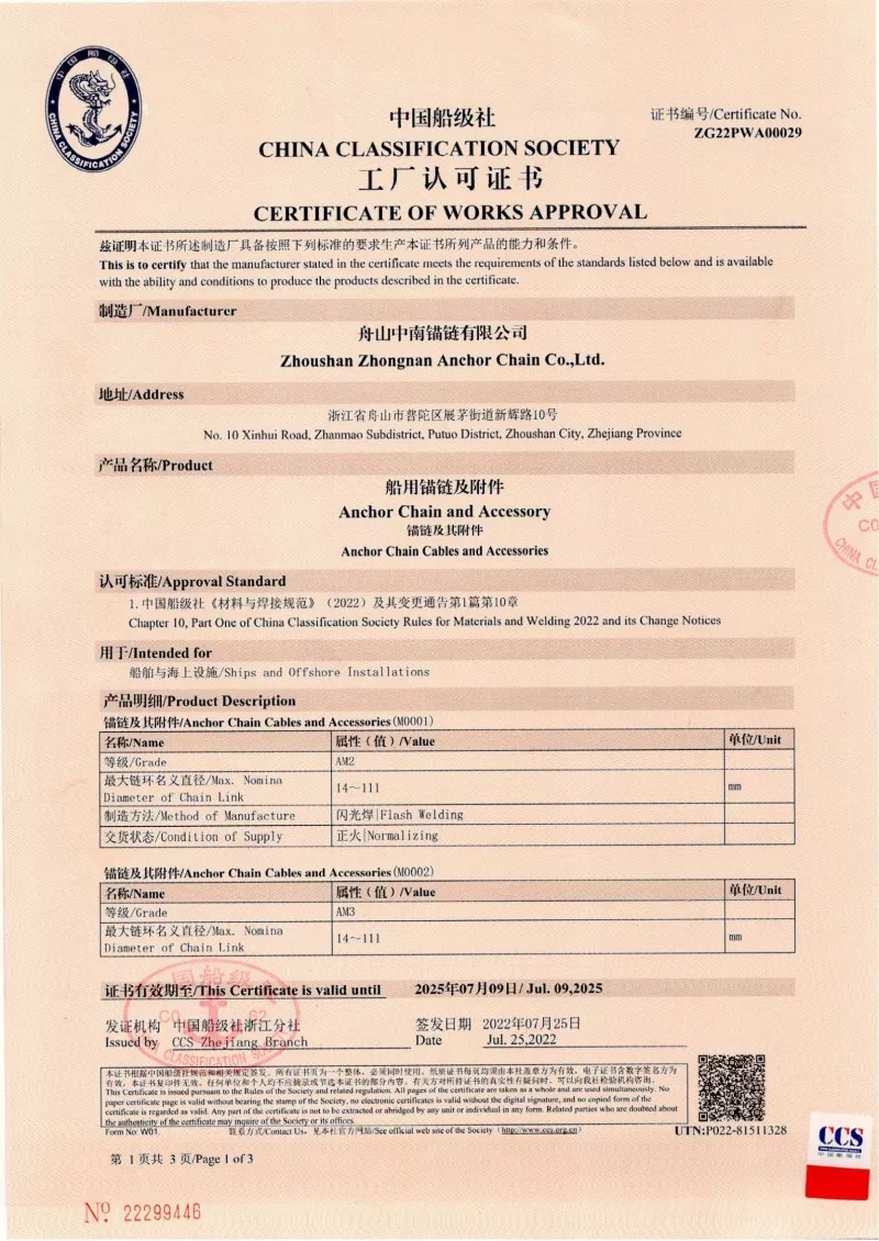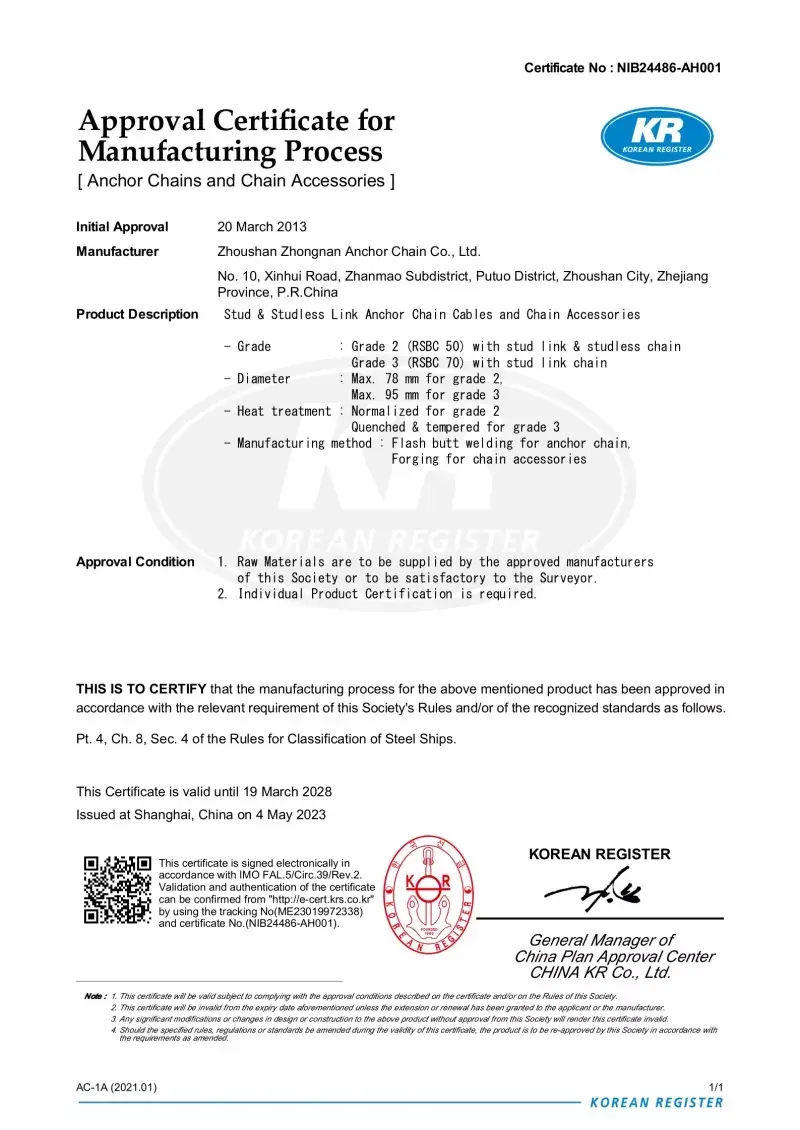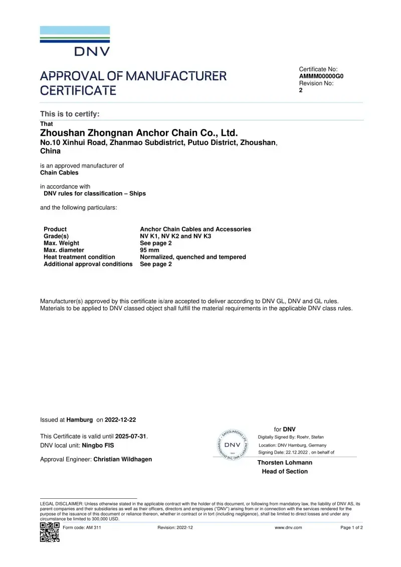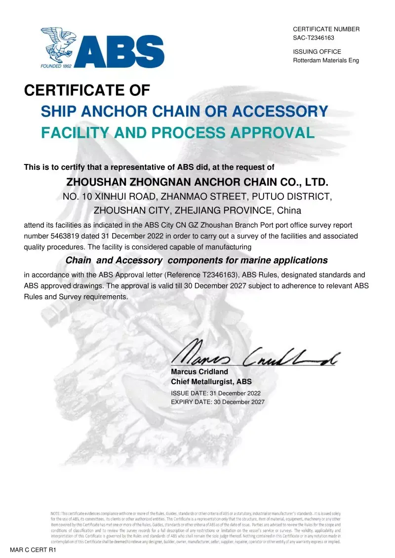 Ja. Alt vores ankerkædetilbehør er fremstillet i overensstemmelse med de samme internationale standarder, der gælder for selve ankerkæderne (ISO, IACS), herunder godkendelser fra CCS, ABS, DNV, LR, BV, NK, KR, RINA og RS. Disse certificeringer sikrer, at tilbehøret opfylder kravene til dimensionel nøjagtighed, sikkerhed og mekanisk styrke, der er indstillet af globale skibsbygere og offshore -operatører.