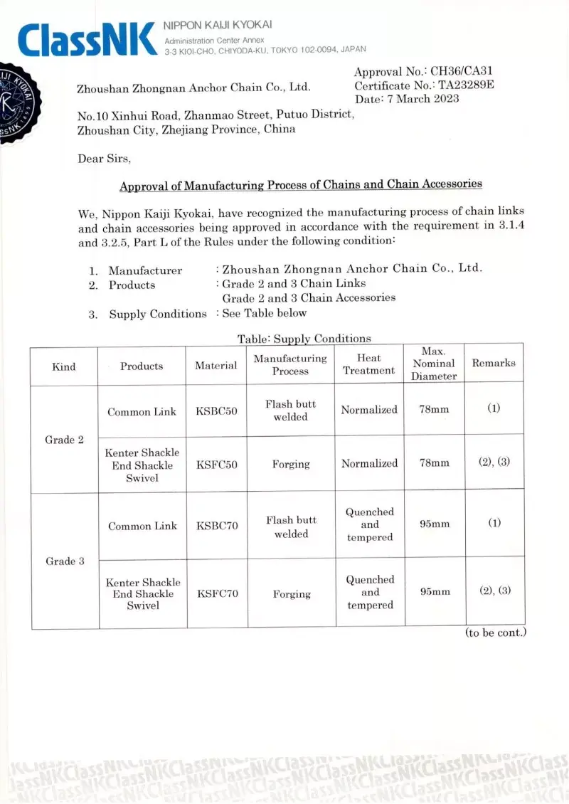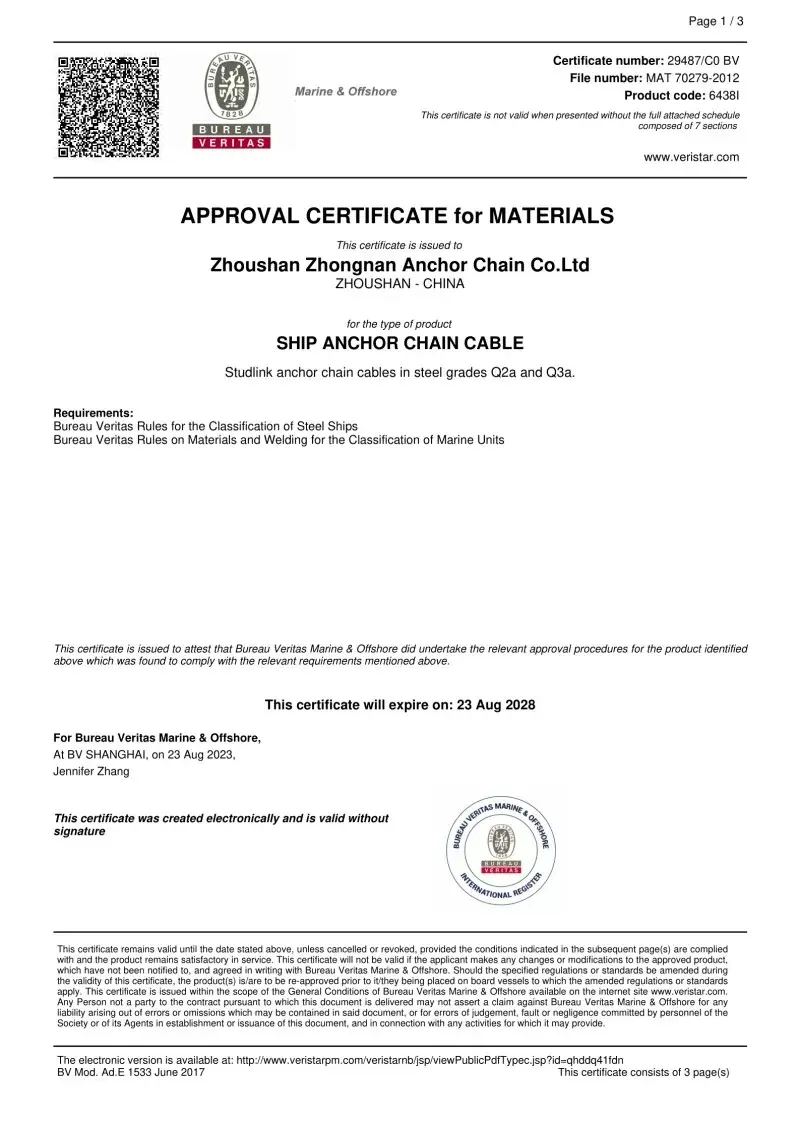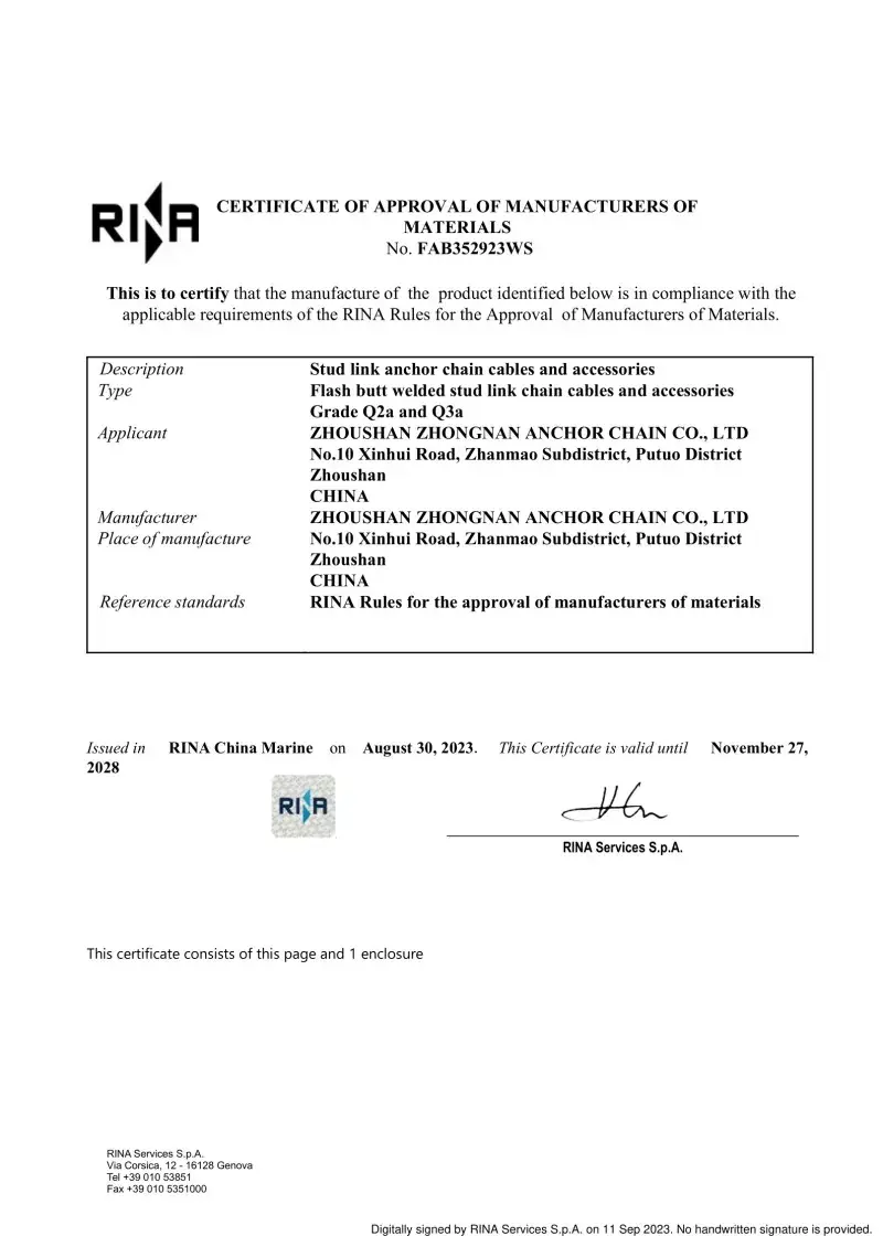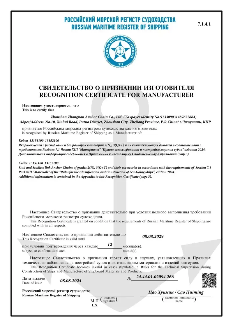 Ja. Alt vores ankerkædetilbehør er fremstillet i overensstemmelse med de samme internationale standarder, der gælder for selve ankerkæderne (ISO, IACS), herunder godkendelser fra CCS, ABS, DNV, LR, BV, NK, KR, RINA og RS. Disse certificeringer sikrer, at tilbehøret opfylder kravene til dimensionel nøjagtighed, sikkerhed og mekanisk styrke, der er indstillet af globale skibsbygere og offshore -operatører.